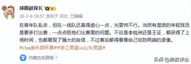 北京时间2月6日,CBA常规赛继续开打,浙江男篮88-89不敌山东男篮,无缘晋级四强。此役,浙江潜力新星李悦洲登场9分钟多,2中0,罚球4中4,得到4分4犯规,而一些冒险的处理球,以及被山东男篮点名引发外界的热议,邱彪明显把李悦洲作为突破口之一。这让李悦洲经验不足的短板进一步被放大,尤其是与陈林坚对位,侧身防守动作,犯规比较明显。 媒体人赵探长发文点评:...